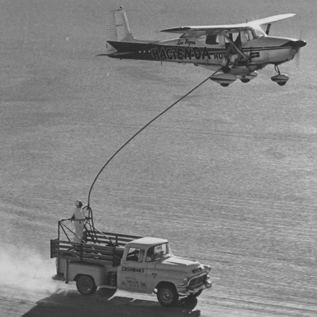 But if really determined to stay up, one could arrange mid-air transfers to fresh planes. Does this sound like a difficult and risky stunt? Compared to the extreme lengths we go to in arranging space travel, plane-hopping is a piece of cake, and has been done hundreds of times starting in 1920! How hard would it really be to arrange a mid-air airplane docking mechanism, compared to rocket science and space-docking at 7 kilometers per second?
