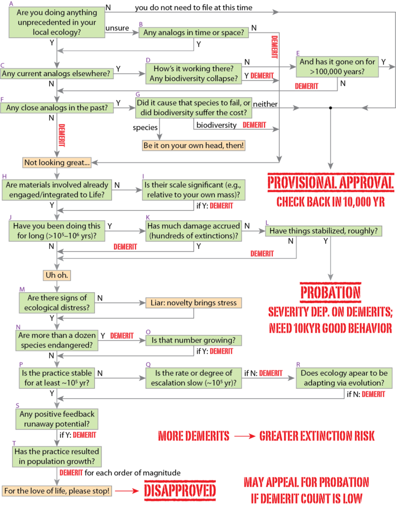 The flowchart is not a perfect or precise tool: just something pulled together over a day or two. Maybe in a way similar to the Limits to Growth models, it is best not to take the model literally, but rather appreciate the overall thrust, timescales, and areas of concern. In fact, instead of viewing the flowchart as trying to algorithmize ecological decision-making (a futile task), think of this flowchart as a poor translator: trying to land a point for brains attracted to and conditioned on algorithmic thinking—perhaps providing a glimmer of insight otherwise unavailable in our ecologically-disconnected lives. Just as language is a crude tool leading to artificial categorization and (mental) boundaries, this flowchart only hints at a far more nuanced process.